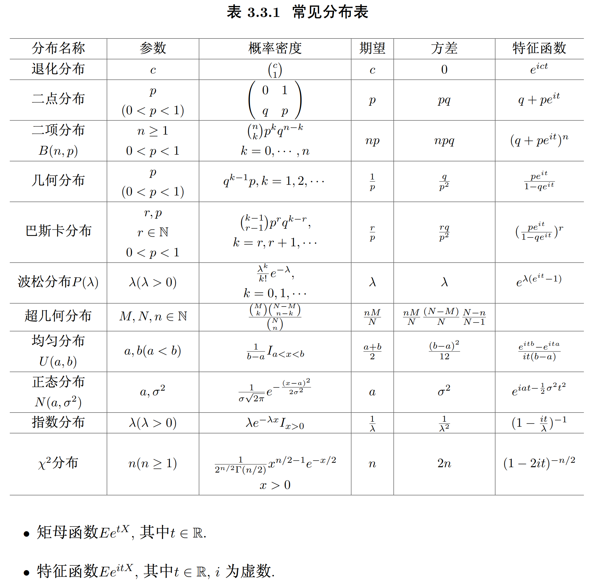表 3.3.1 常见分布表