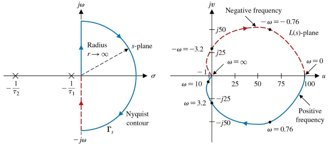 S平面上围线 ΓS\Gamma_{S} 的正虚轴部分 +jω+j\omega,映射为 L(s)L(s) 平面上 Nyquist 图;负虚轴部分 jω-j\omega,映射到 L(s)L(s) 平面与 Nyquist 图关于实轴对称(负频率特性);半径为 rr \to \infty 的半圆周映射为 L(s)L(s) 平面的原点。